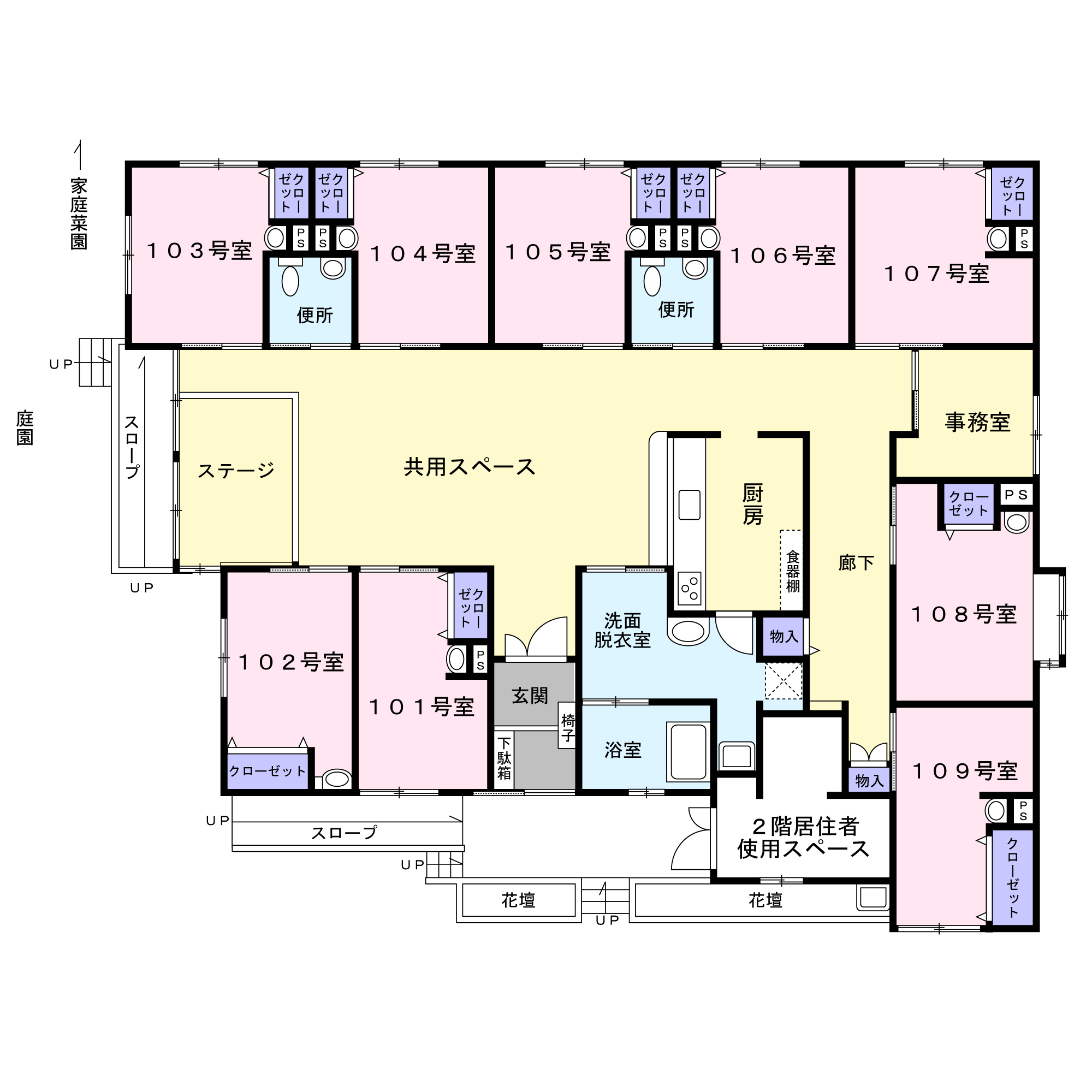鍵付きの個室が9室あり、すべてバリアフリー設計。廊下、浴室手すり付、室内段差なしバリアフリー、火災時緊急通報ボタンも備えています。